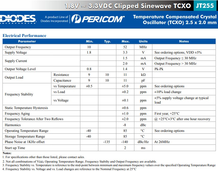 JT255系列是高性能溫度補償振蕩器,具有削波正弦波輸出,可實現非常低的工作電源電流。1.8V~3.3VDC削波正弦波TCXO,它支持各種電源電壓、穩定性和其他功能。它旨在滿足現有的應用需求。特征: