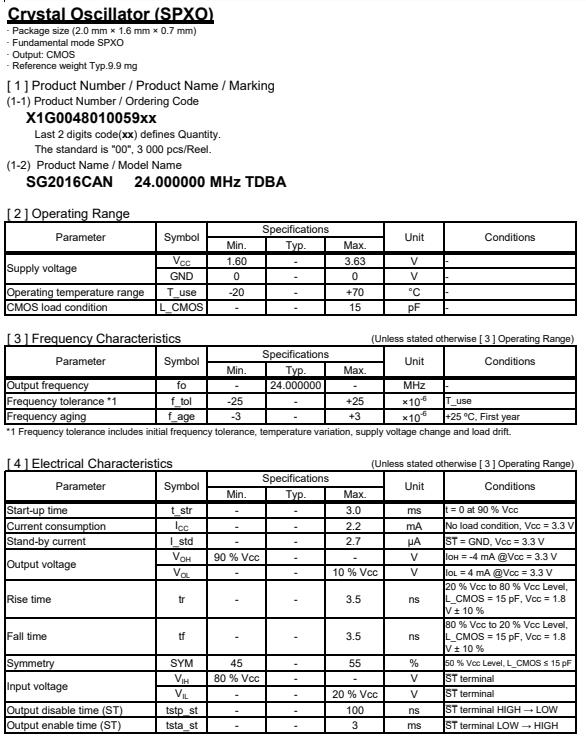 | X1G004801005900 | SG2016CAN | 24.000000 MHz | 2.00 x 1.60 x 0.70 mm | CMOS | 1.600 to 3.630 V | -20 to 70 °C | +/-25 ppm |