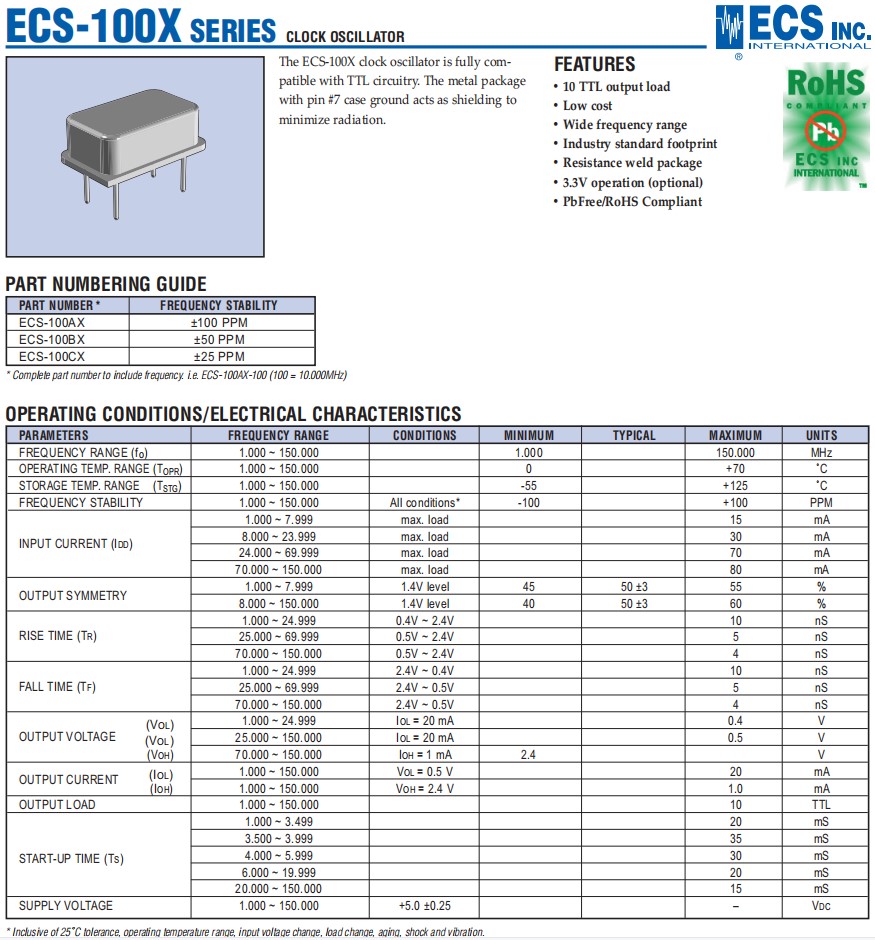 ECS通訊晶振,ECS-100AX-147.4,ECS-100X時(shí)鐘振蕩器6G晶振,參數(shù)表