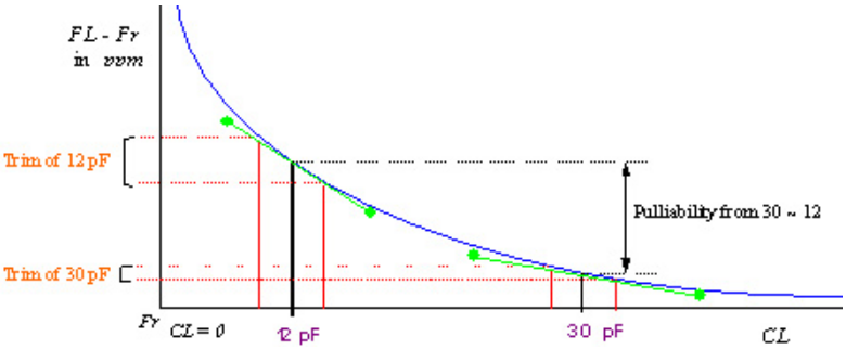 FL = FR *(1 + C1 / 2 *(C0 + CL))其中該曲線表示電容變化與頻率變化的變化(頻率可變性):
