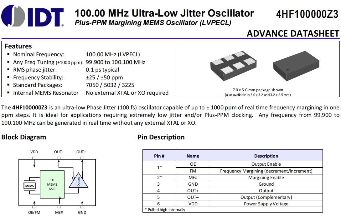 | 4HF100000Z3BACXGI | IDT晶振 | OSC MEMS 100.000MHZ LVPECL SMD | 4HF | 100MHz |