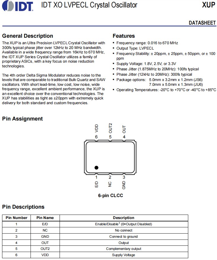 | XUP536100.000JS6I | IDT晶振 | OSC XO 100.0000MHZ LVPECL SMD | XUP | 100MHz | LVPECL |
