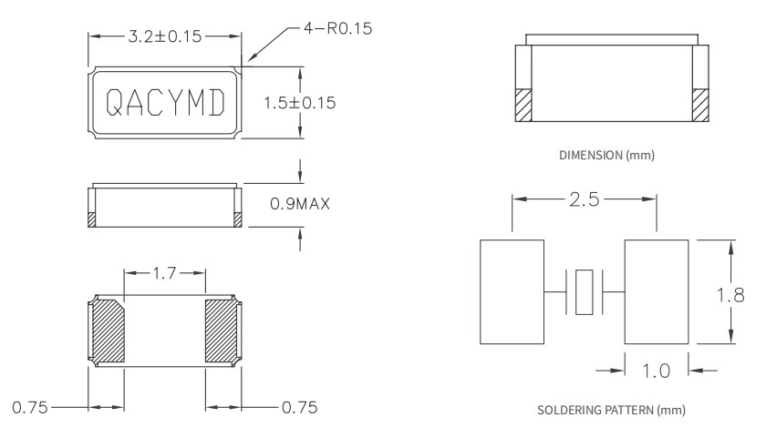 Interquip計時產品,SMLF-3215,3215mm晶振,6G顯示器晶振,智能手機晶振,石英貼片晶振,尺寸圖