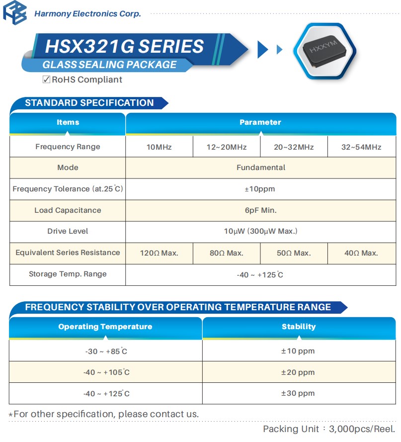 HELE石英晶體諧振器HSX321G,3225mm石英晶振,汽車(chē)電子6G晶振,小體積晶振,高品質(zhì)晶振,臺(tái)灣HELE加高晶振,型號(hào):HSX321G,小體積晶振尺寸:3.2x2.5mm,SMD石英晶體,四腳貼片晶振,石英晶振,無(wú)源晶振,石英晶體諧振器,無(wú)鉛環(huán)保晶振,工作溫度范圍選項(xiàng):-30℃至+85℃,-40℃至 +105℃,-40℃至+125℃。具有超小型,輕薄型,高品質(zhì)晶振,耐熱及耐環(huán)境特點(diǎn)。被廣泛應(yīng)用于:通訊設(shè)備,汽車(chē)電子用晶振,車(chē)載控制器,無(wú)線藍(lán)牙模塊,智能手機(jī),可穿戴設(shè)備,小型便捷式設(shè)備,平板電腦,醫(yī)療設(shè)備,安防設(shè)備,數(shù)碼電子等應(yīng)用。