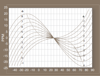 其中A0至a5是要生成的多項式的系數(shù),T是當(dāng)前溫度,Ti是晶體的拐點溫度(晶體曲線相對于上下轉(zhuǎn)折點居中的溫度,通常在+26°C左右).
