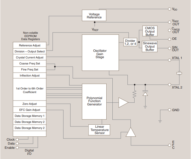 TCXO應(yīng)用中出現(xiàn)的最新設(shè)備是復(fù)雜的大規(guī)模集成電路,結(jié)合了精密模擬功能、非易失性數(shù)字存儲、變?nèi)荻O管和RF振蕩器電路[7].圖2展示了通用設(shè)備的框圖.盡管第一代制造導(dǎo)致了相對較大的芯片,但幾何尺寸的減少產(chǎn)生了更小的集成電路,使得一個完整的精密TCXO能夠封裝在一個小至5032貼片晶振的封裝中.■多項式函數(shù)發(fā)生器