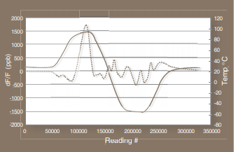 顯示了回轉(zhuǎn)溫度運行期間的20MHz振蕩器.紅色曲線顯示右側(cè)y軸上的腔室溫度4,藍(lán)色曲線是左側(cè)y軸上的振蕩器頻率.x軸將時間繪制為