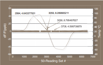 標(biāo)準(zhǔn)化為讀數(shù)(每次讀數(shù)需要20毫秒).從+25°C開始,以8°C/分鐘的速度將腔室升至+90°C.穩(wěn)定后,它以相同的速度下降到-60℃.除了溫度超過補償范圍的熱端峰值之外,可以看出斜坡的影響很小,從相反方向的斜坡可以看出很少滯后.■擾動和微跳躍