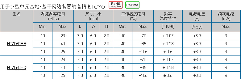 NT7050BC晶體,十腳貼片晶體,NDK溫補晶振產(chǎn)品本身具有溫度補償作用,高低溫度穩(wěn)定性:頻率精度高0.5 PPM?2.0 PPM,工作溫度范圍: - 30度85度,電源電壓:1.8V、3.3V之間可供選擇,產(chǎn)品本身具有溫度電壓控制功能,世界上最薄的晶振封裝,頻率:26兆赫,33.6兆赫,38.4兆赫,40兆赫,因產(chǎn)品性能穩(wěn)定,精度高等優(yōu)勢,被廣泛應用到一些比較高端的數(shù)碼通訊產(chǎn)品領(lǐng)域,GPS全球定位系統(tǒng),智能手機,WiMAX和蜂窩和無線通信等產(chǎn)品,符合RoHS/無鉛.