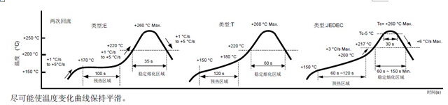 加熱包裝材料至+150°C以上會破壞產品特性或損害產品.如需在+150°C以上焊接晶體產品,建議使用SMD晶振產品.在下列回流條件下,對晶體產品甚至SMD產品使用更高溫度,會破壞產品特性.建議使用下列配置情況的回流條件.安裝這些產品之前,應檢查焊接溫度和時間.同時,在安裝條件更改的情況下,請再次進行檢查.如果需要焊接的晶體產品在下列配置條件下進行焊接,請聯系我們以獲取耐熱的相關信息.