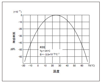 關(guān)于頻率溫度特性例:音叉型石英晶振的頻率溫度特性如左側(cè)的曲線圖所 示,顯示了以+25°C為頂點(diǎn)的負(fù)向2次方程曲線. 溫度范圍越寬,則頻率的變化量也越大,因此,需要 考慮一下所使用環(huán)境的溫度范圍和必要的精度.