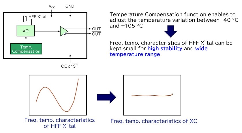 用于SPXO的HFF晶體芯片和內部低噪聲IC實現了低相位抖動/相位噪聲特性。
