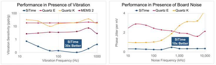 在包括正弦振動(dòng)和隨機(jī)振動(dòng)在內(nèi)的各種條件下,使用標(biāo)準(zhǔn)化的測(cè)試方法具有相似的規(guī)格.如圖6和7所示,SiTime的基于記憶的振蕩器表現(xiàn)出出色的抗振動(dòng)和電路板噪聲能力.閱讀更多關(guān)于測(cè)試的信息