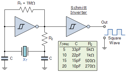 晶體以串聯(lián)諧振頻率振蕩。CMOS反相器初始通過反饋電阻R1偏置到其工作區(qū)域的中間。這確保了逆變器的Q點處于高增益區(qū)域。這里使用一個1MΩ值的電阻,但只要1MΩ以上,它的值并不重要。附加的反相器用于將振蕩器的輸出緩沖到連接的負載。
