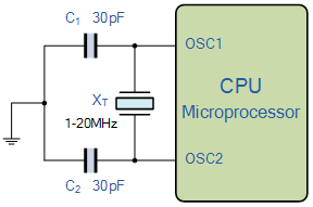 大多數(shù)微處理器,微控制器和PIC都有兩個標(biāo)記為OSC1和OSC2的振蕩器引腳,用于連接外部石英晶體電路,標(biāo)準(zhǔn)RC振蕩器網(wǎng)絡(luò)甚至陶瓷諧振器。在這種類型的微處理器應(yīng)用中,石英晶體振蕩器產(chǎn)生一系列連續(xù)的方波脈沖,其基本頻率由晶體本身控制。這個基本頻率調(diào)節(jié)控制處理器設(shè)備的指令流。例如,主時鐘和系統(tǒng)時序。