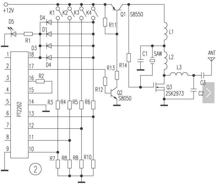 這是一個帶地址編碼的四鍵微型超遠程遙控發射機,電路原理見下: R11~R13、Q1、Q2組成電子開關式調制電路,當編碼器輸出為高電平時Q1導通,振蕩發射級工作;當編碼器輸出為低電平時Q1截止,振蕩發射級停止工作,從而完成ASK調制。R14、Q3、C1、L1、L2及聲表諧振器SAW組成315MHz的功率振蕩級,Q3為高頻功率場效應管,在450MHz下可輸出1.5W的功率,其中L1、L2及C1組成SAW所需要的移相選頻及匹配網絡,使Q3與SAW在很高的效率下工作。L3、C2及C3組成天線匹配網絡,使天線阻抗與振蕩級匹配,確保其穩定工作。