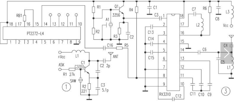 接收機是用聲表面濾波器穩頻的超外差式成品板,電路原理見下: 接收機以集成電路RX3310為核心元件,組成ASK制解調的超外MHz式接收機,其靈敏度為-105dBm。RX3310的①、②腳為本機振蕩回路元件連接端,外接一個LC選頻網絡即可產生本振信號。為了提高本機穩定性,本振信號用外接的聲表穩頻振蕩電路產生,通過①腳輸入。解調出的數據信號從⑧腳輸出送入解碼器解碼。
