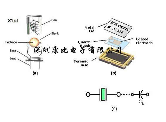 (如圖)(a)及(b)分別是DIP型式及SMD型式的石英振蕩子的基本結構圖. (如圖)(c)是電子電路上所使用代表石英振蕩子的電子符號. 當石英晶體共振子處在遠離振蕩頻率區域時, 石英晶體共振子僅是一個電容性的組件, 當頻率接近石英晶體的振蕩頻率時, 就接近是一個電感性的等效LCR振蕩線路.